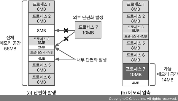 ํ ๋นํ ๋ฉ๋ชจ๋ฆฌ๋ฅผ ํด์ ํ๋ฉด ๊ทธ ๋ฉ๋ชจ๋ฆฌ ๊ณต๊ฐ์ด ๋น ๊ณต๊ฐ(์ฌ์ฉํ์ง ์๋ ๊ณต๊ฐ) ์ด ๋๊ณ ๊ทธ ๋น ๊ณต๊ฐ์ ํฌ๊ธฐ๋ณด๋ค ํฐ ๋ฉ๋ชจ๋ฆฌ๋ ์ฌ์ฉํ ์ ์์ต๋๋ค. ๊ทธ๋ฆฌํ์ฌ ์ด ๊ณต๊ฐ๋ค์ด ํ๋ ๋ ์์ด๊ฒ ๋๋ฉด ์์น์์ผ๋ก๋ ๋ง์ ๋ฉ๋ชจ๋ฆฌ ๊ณต๊ฐ์ด ๋จ์์์๋ ๋ถ๊ตฌํ๊ณ , ์ค์ ๋ก ์ฌ์ฉํ ์ ์๋ ๋ฉ๋ชจ๋ฆฌ๊ฐ ๋ฐ์ํฉ๋๋ค. ์ด๋ ๊ฒ ๊ณต๊ฐ์ ์์ผ๋ ์๋ก์ด ํ๋ก์ธ์ค๋ฅผ ํ ๋นํ ์ ์๋ ์ํฉ์ผ๋ก ํฌ๊ฒ ๋ด๋ถ, ์ธ๋ถ ๋จํธํ๊ฐ ์์ต๋๋ค.